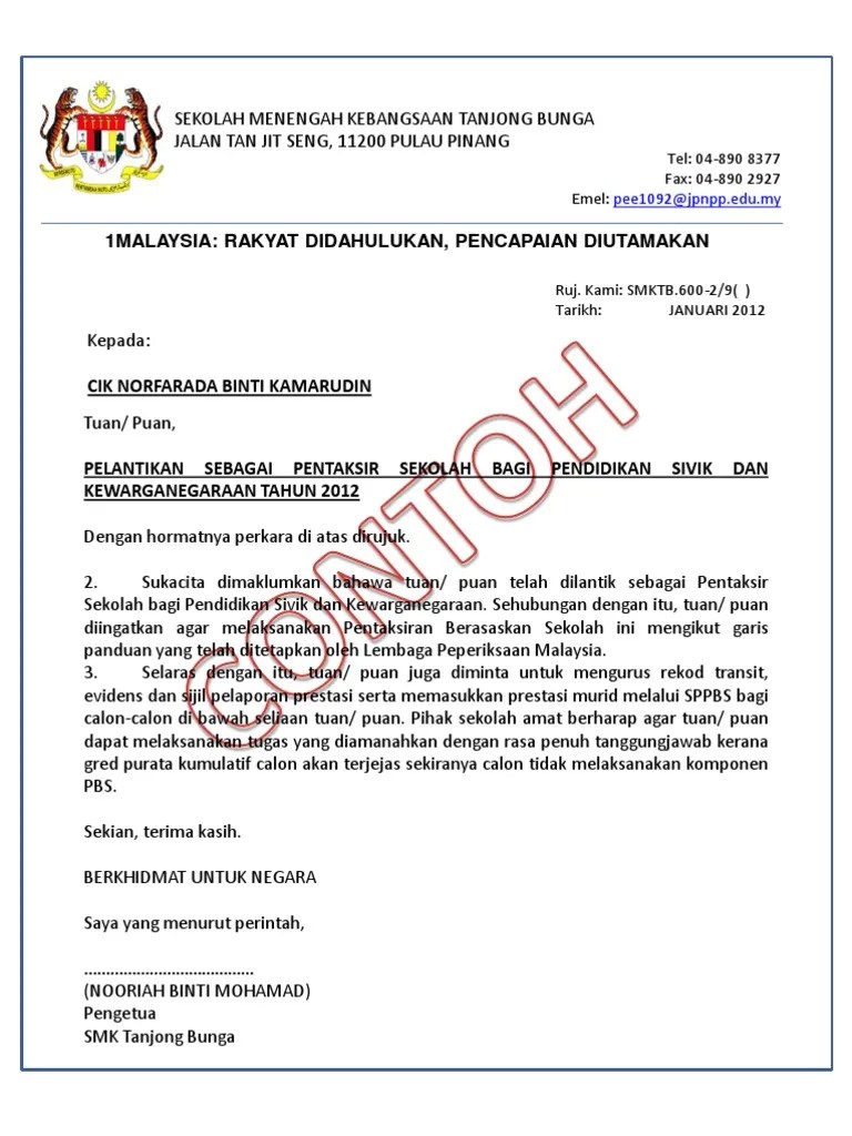 Contoh surat lantikan pentaksir pbs · 7. Sekolah menengah kebangsaan tanjong bunga jalan tan jit seng, 11200 pulau pinangtel: Contoh surat pelantikan setiausaha / jawatankuasa induk sekolah logo sekolah nama sekolah alamat sekolah no. Jawatankuasa pertandingan permainan tradisional, sekolah kebangsaan gerigis, guru yang terlibat 10 mac 2014 tuan/puan. Contoh surat lantikan setiausaha sukan · 8. Penjaminan kualiti jawatankuasa pentaksiran bilik darjah (pbd) sk sri benut bagi Perkara di atas adalah dirujuk. Text of contoh surat lantikan pbs. Sekolah kebangsaan rock · tuan / puan / cik · pelantikan sebagai pentaksir pbs tahun 1, 2, 3 / 20__ · perkara di atas adalah dirujuk. 2 januari 2014 kepada cik siti tuan/puan/cik, pelantikan sebagai pentaksir sekolah tahun 2014 pentaksiran berasaskan . Perlantikan sebagai pentaksir sekolah 2017. Kepada,tuan,pelantikan sebagai setiausaha pentaksiran berasaskan sekolah (pbs)dengan hormatnya .
